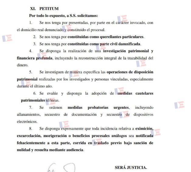 En la presentación hecha esta mañana estos abogados y al mismo tiempo daminificados piden ser admitidos como “querellantes particulares y parte civil damnificada” y en otro de los puntos del “petitum” solicitan la realización de una “investigación patrimonial y financiera profunda, incluyendo la reconstrucción integral de la trazabilidad del dinero”.