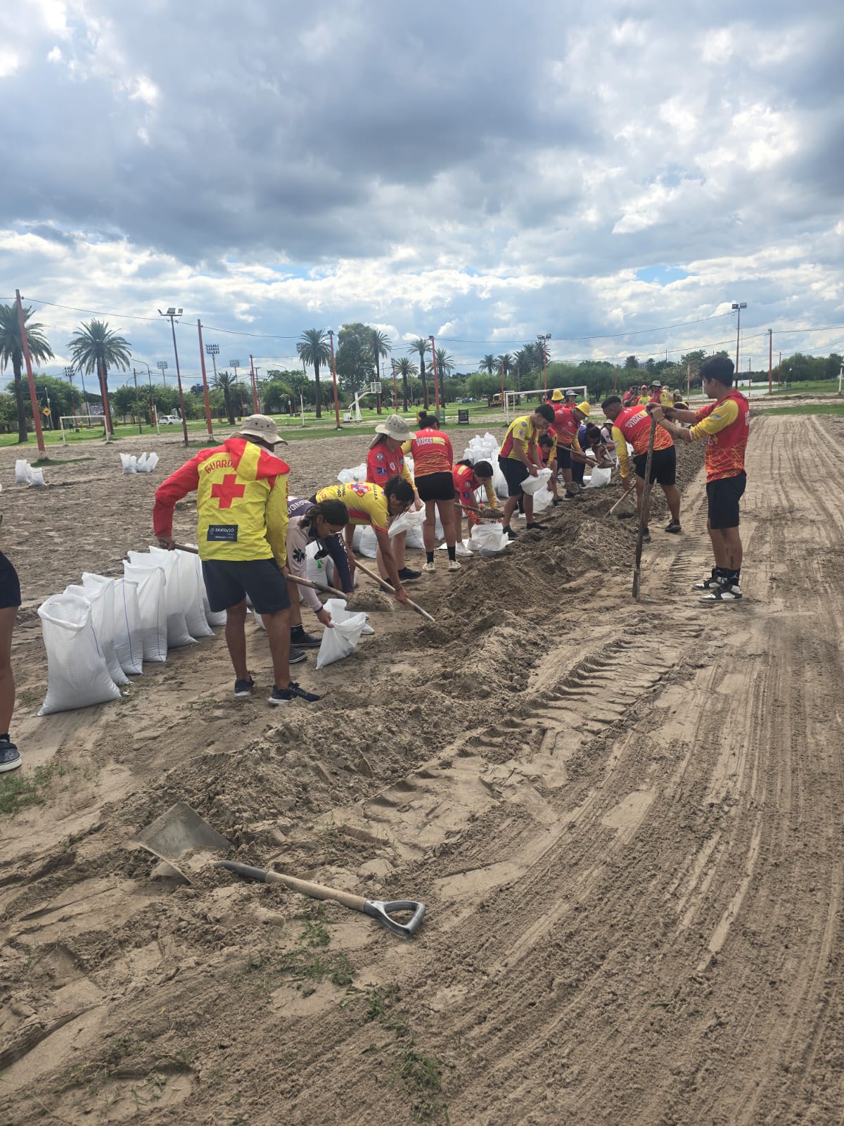 En el marco del operativo preventivo por la crecida del río Dulce, guardavidas de Santiago del Estero realizan tareas de armado y llenado de bolsas de arena destinadas a reforzar las defensas en distintos puntos de la ribera.