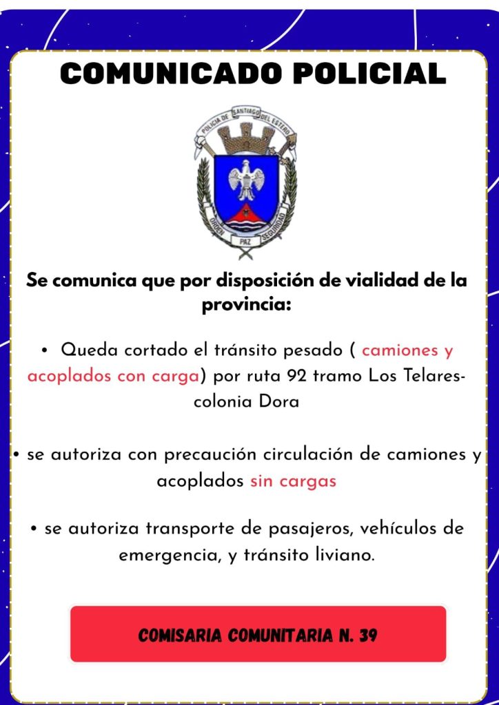 La Policía de la Provincia informó la restricción de circulación por la Ruta 92 en el tramo Los Telares-Colonia Dora. La medida fue dispuesta por Vialidad de la Provincia, en el marco de las acciones preventivas ante la crecida del río Dulce.