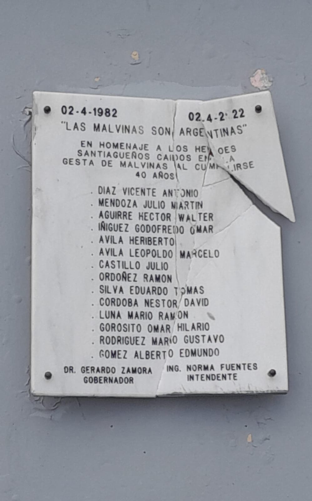 “Con gran indignación y bronca, vi que rompieron la placa en el monumento a los Héroes de Malvinas”, expresó el vecino en su mensaje enviado a este medio.