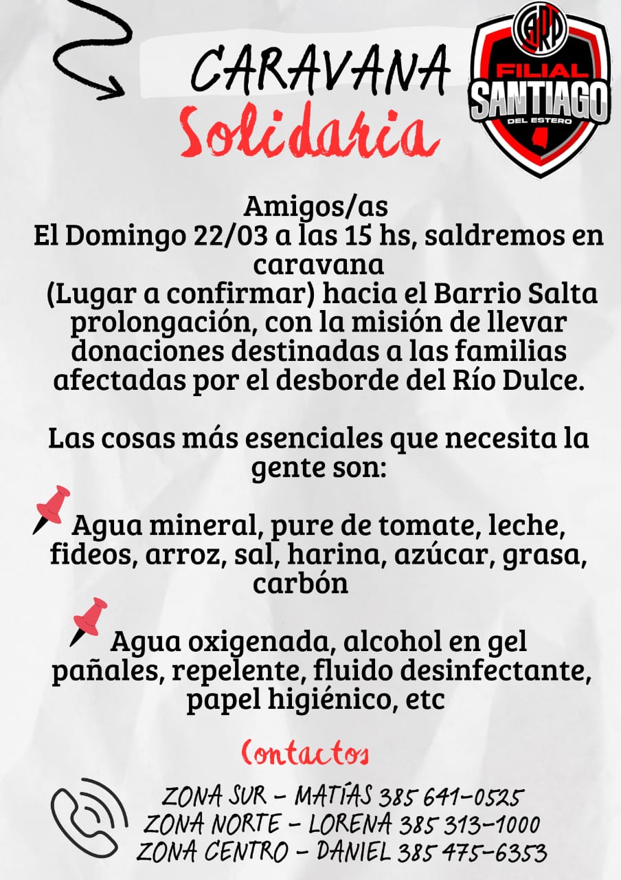 Este domingo 22 de marzo a partir de las 15, en lugar a confirmar, la filial de Santiago de River realizará una caravana solidaria hacia el barrio Salta Prolongación de la ciudad de La Banda con la misión de llevar donaciones a las familias afectadas por el desborde del Río Dulce la semana pasada.