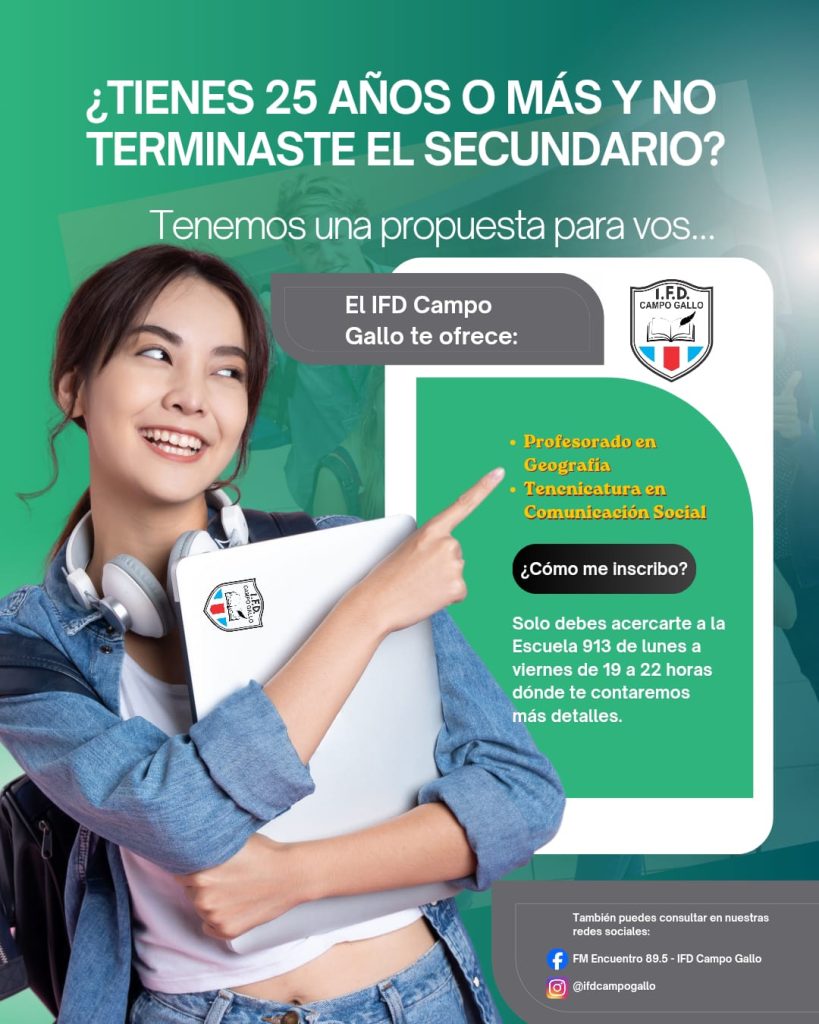 Los interesados en dar este paso hacia su crecimiento profesional deben dirigirse a la sede de la institución (que funciona en el edificio de la Escuela N° 913), horario de atención: Lunes a viernes de 19:00 a 22:00 hs, o pueden realizarse consultas digitales en Facebook “FM Encuentro 89.5 – IFD Campo Gallo” o en Instagram: @ifdcampogallo