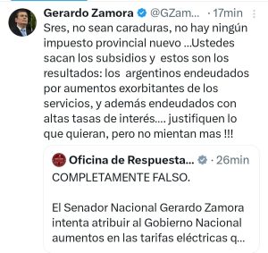 Hace minutos, Zamora usó su cuenta oficial de X, para repostear la publicación de la Oficina y sostuvo: “Sres, no sean caraduras, no hay ningún impuesto provincial nuevo…”