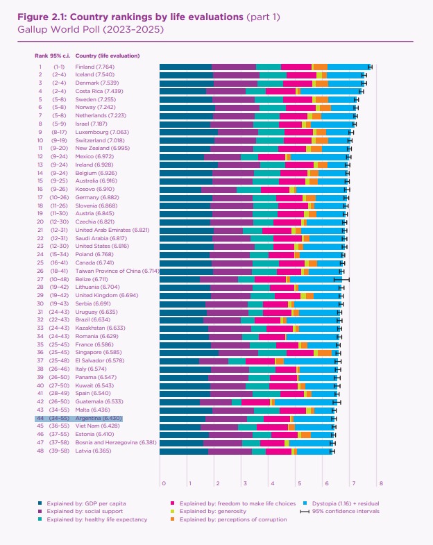 En ese marco, el último Informe Mundial de la Felicidad —elaborado por el Centro de Investigación sobre el Bienestar de la Universidad de Oxford junto a Gallup y la ONU— ubicó a Argentina en el puesto 43, con una puntuación cercana a los 6,43 puntos en la evaluación de vida.