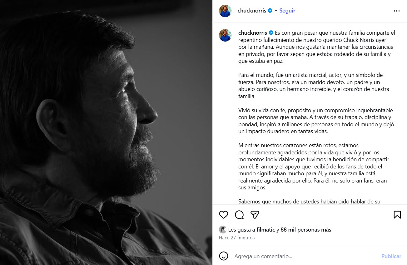 “Con profunda tristeza, nuestra familia comparte el repentino fallecimiento de nuestro querido Chuck Norris ayer por la mañana [jueves]. Si bien deseamos mantener la privacidad de las circunstancias, les informamos que estaba rodeado de su familia y descansaba en paz. Para el mundo, fue un artista marcial, actor y un símbolo de fuerza”, introduce el comunicado publicado este viernes por la mañana.