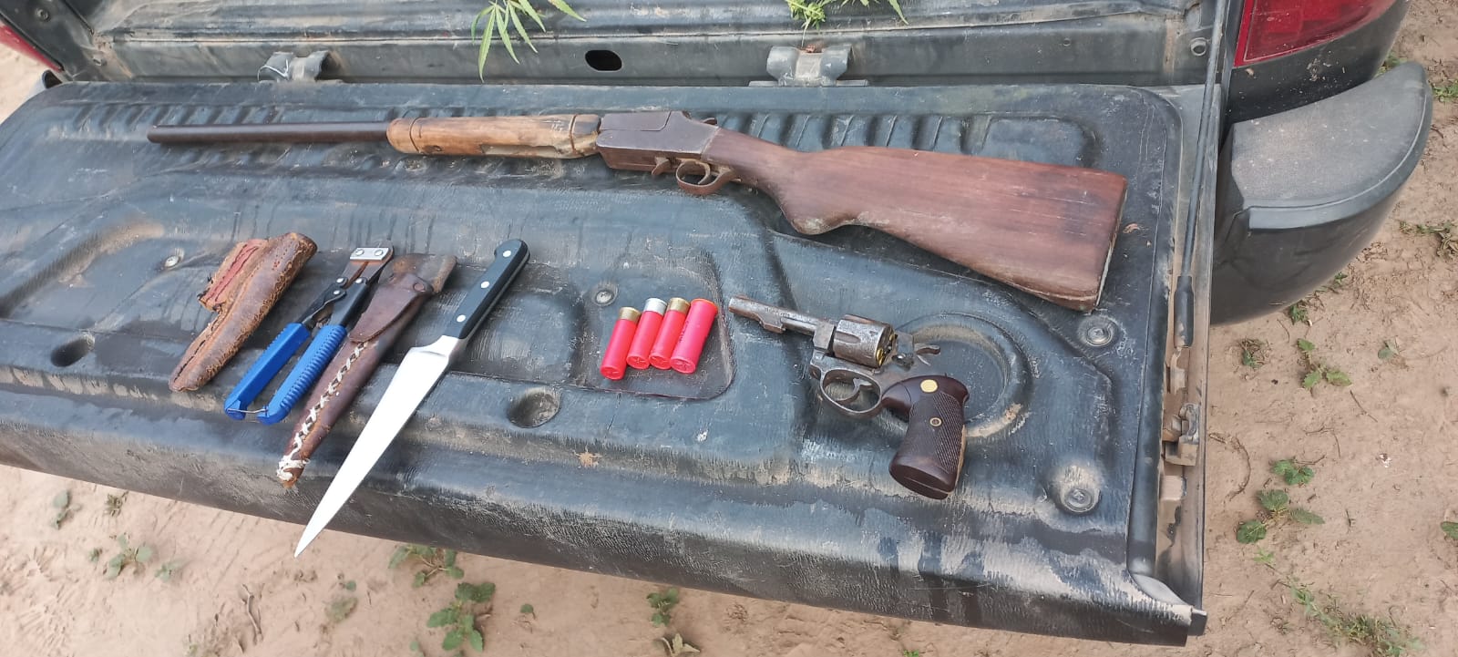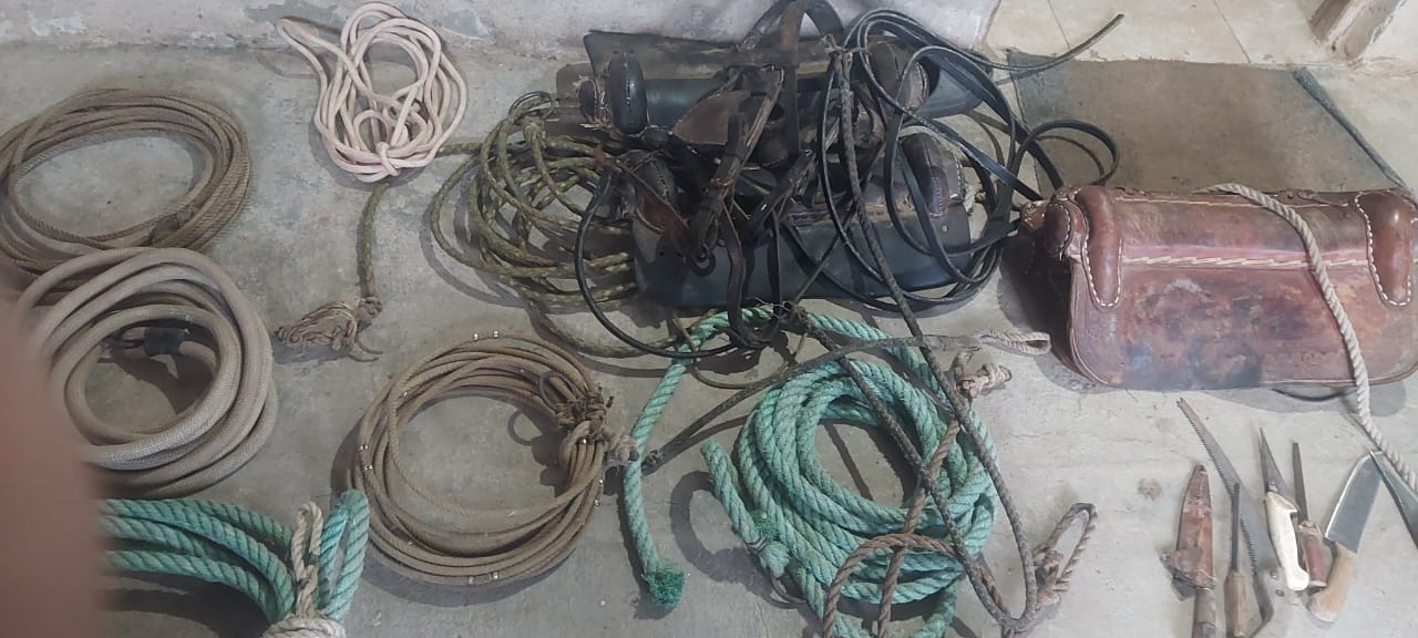 Elementos secuestrados: dos monturas de apero,ocho sogas,una escopeta calibre 16,un revolver calibre 32,con sus respectivos proyectiles,un alicate de barbero y elementos para faena. (Cuchillos,sierras )