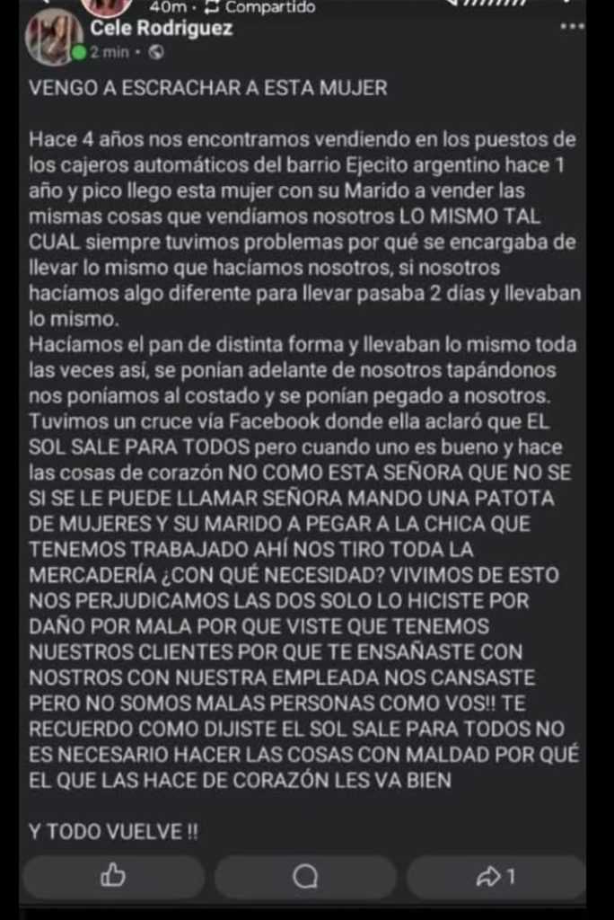 “Hace 4 años nos encontramos vendiendo en los puestos de los cajeros automáticos del barrio Ejército Argentino. Hace un año y pico llegó esta mujer con su mardo a vender las mismas cosas que vencíamos nosotros. Lo mismo tal cual”, relató la usuaria en Facebook.