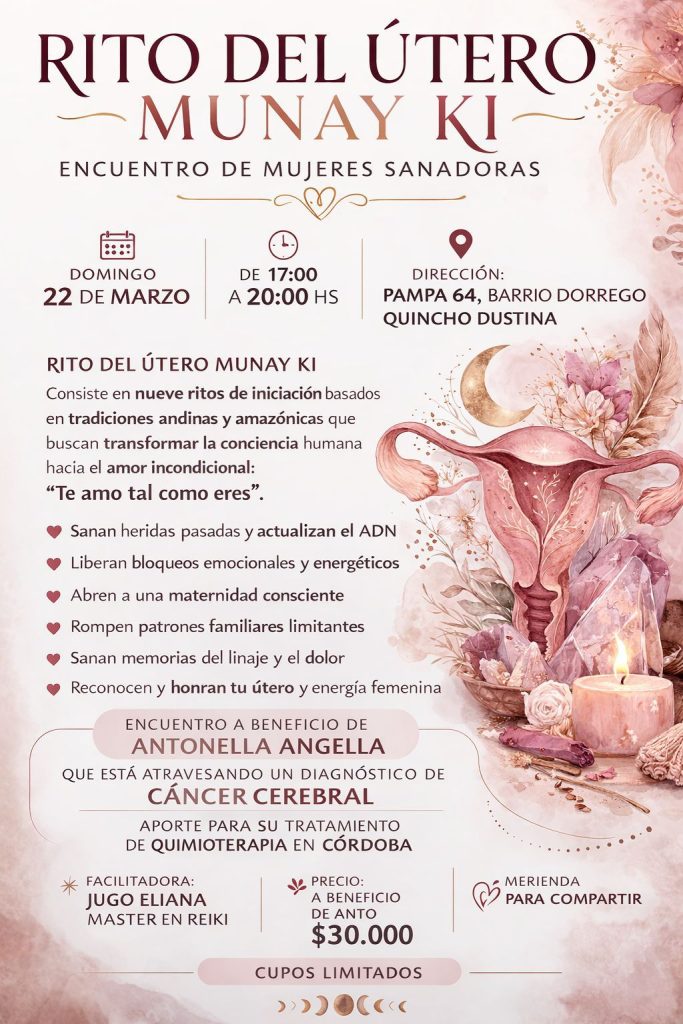 La comunidad de La Banda y Santiago del Estero se une una vez más por una causa urgente. Este domingo 22 de marzo se llevará a cabo el taller “Rito del Útero – Munay Ki”, un espacio de espiritualidad y sanación que, en esta ocasión, tendrá un fin enteramente solidario: recaudar fondos para el tratamiento de la joven bandeña Rocío Antonella Angella.