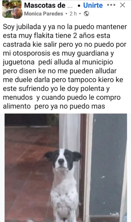 “Soy jubilada y ya no la puedo mantener, está muy flaquita, está castrada y quiere salir pero yo no puedo por mi osteoporosis. Pedí ayuda al municipio pero dicen que no me pueden ayudar. Me duele darla, pero tampoco quiero que esté sufriendo, yo le doy polenta y menudos, cuando puedo le compro alimento, pero ya no puedo más”, escribió en la publicación.