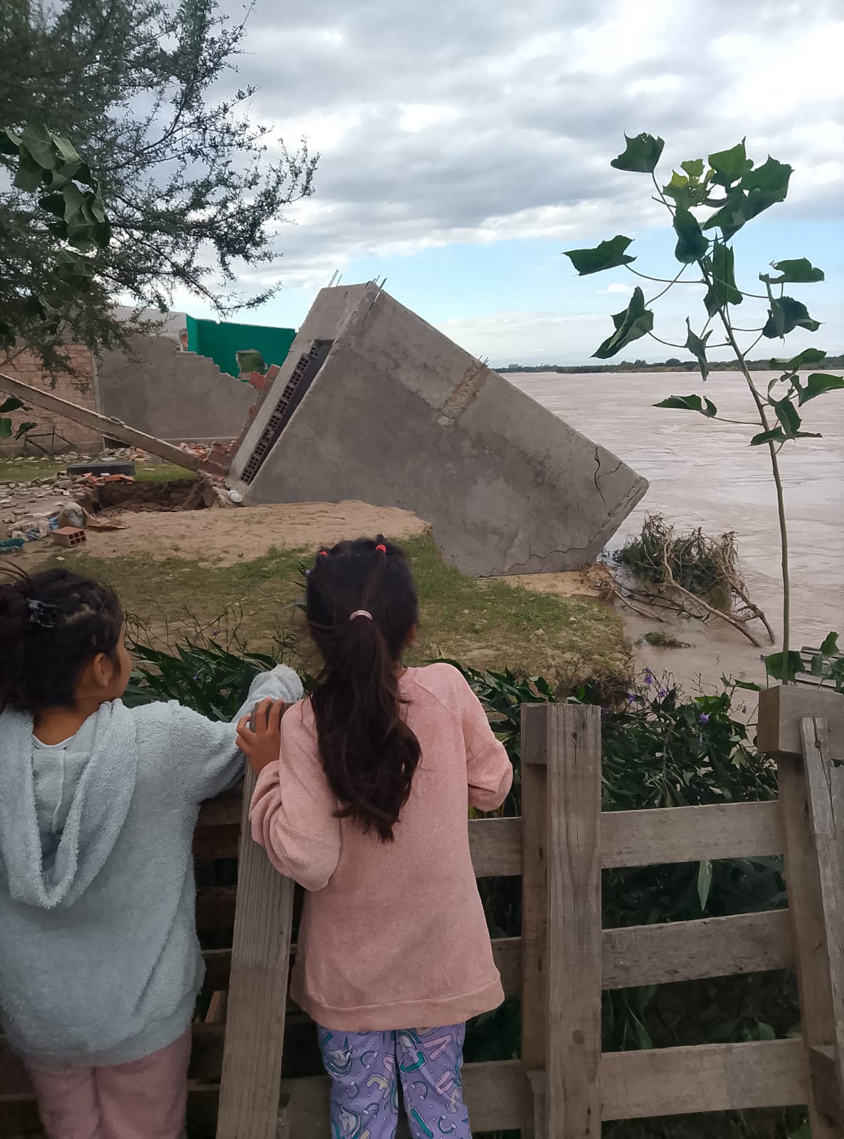 Las construcciones, ubicadas a unos 100 metros del cauce, se vieron afectadas por la erosión del terreno, ya que la fuerza del agua comenzó a socavar la base, debilitando las estructuras.