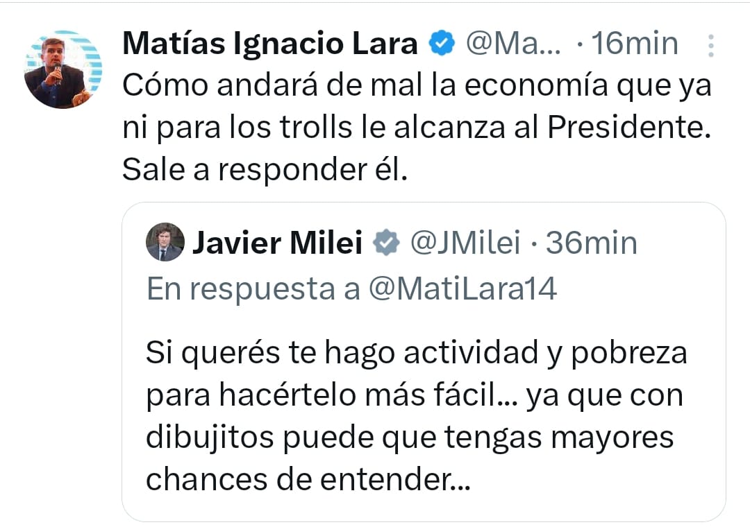 El presidente Javier Milei volvió a quedar en el centro de la escena en redes sociales luego de un cruce con el usuario santiagueño Matías Ignacio Lara, quien cuestionó su gestión económica.