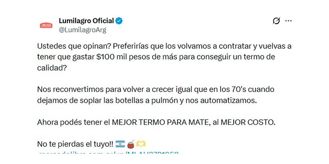 “¿Ustedes qué opinan? ¿Preferirías que los volvamos a contratar y vuelvas a tener que gastar $100 mil de más para conseguir un termo de calidad?”, fue una de las frases que generó rechazo inmediato entre los usuarios. En otra publicación, la cuenta redobló la apuesta con un tono irónico al plantear la posibilidad de lanzar una “edición limitada” de productos “de peor calidad y más caro, pero 100% fabricado en Argentina”.