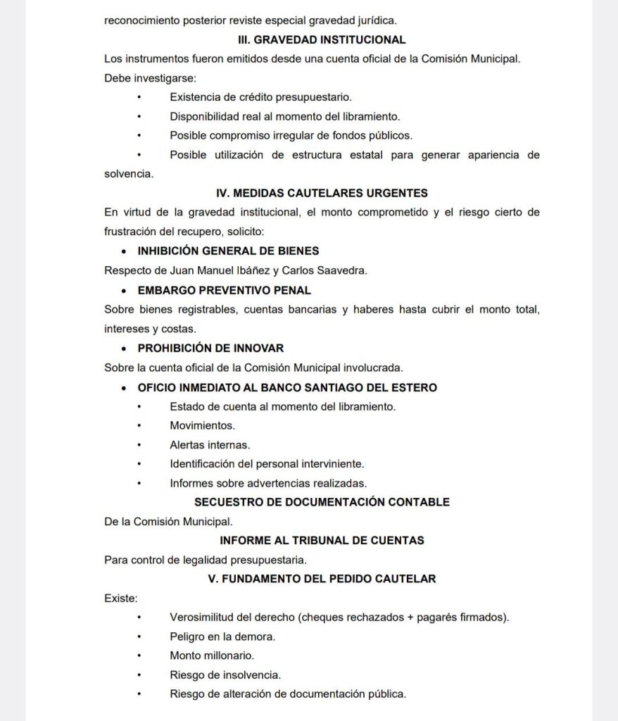 Entre las medidas cautelares pedidas por el doctor Cabañas se destacan la “inhibición general de bienes de Juan Manuel Ibañez y Carlos Saavedra, el embargo preventivo penal”, como así también otro tipo de oficios y pedidos de secuestro de documentación e informes.
