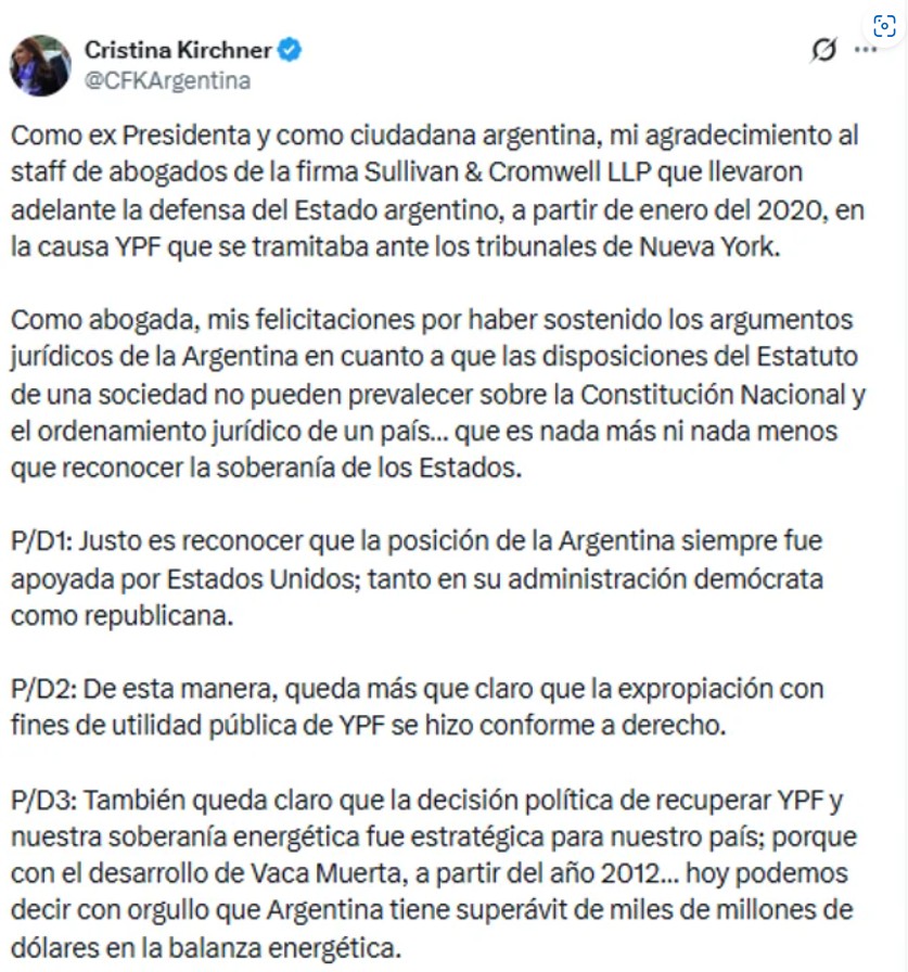 “Como ex presidenta y como ciudadana argentina, mi agradecimiento al staff de abogados de la firma Sullivan & Cromwell LLP que llevaron adelante la defensa del Estado argentino, a partir de enero del 2020, en la causa YPF que se tramitaba ante los tribunales de Nueva York”, expresó la ex mandataria.