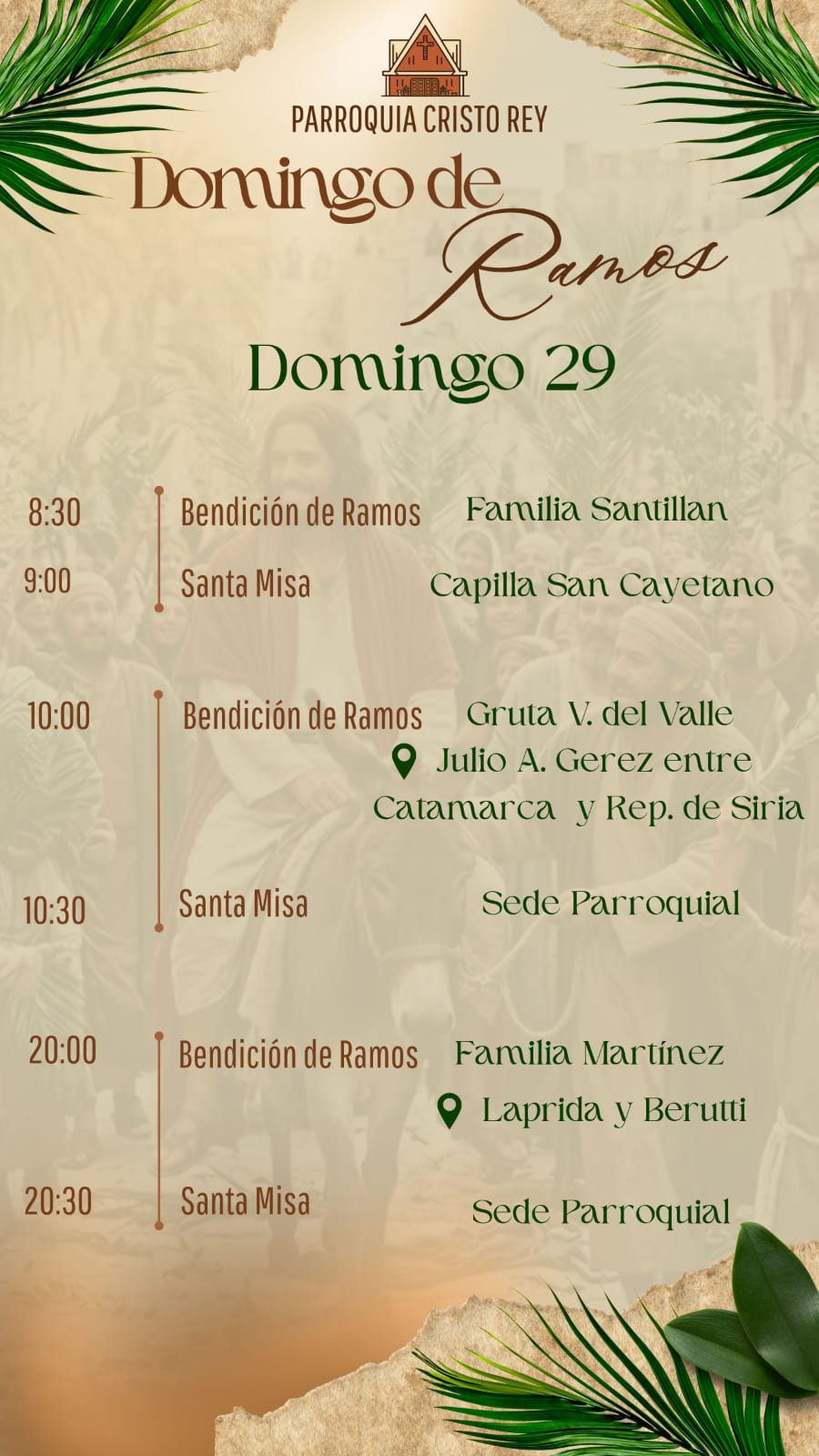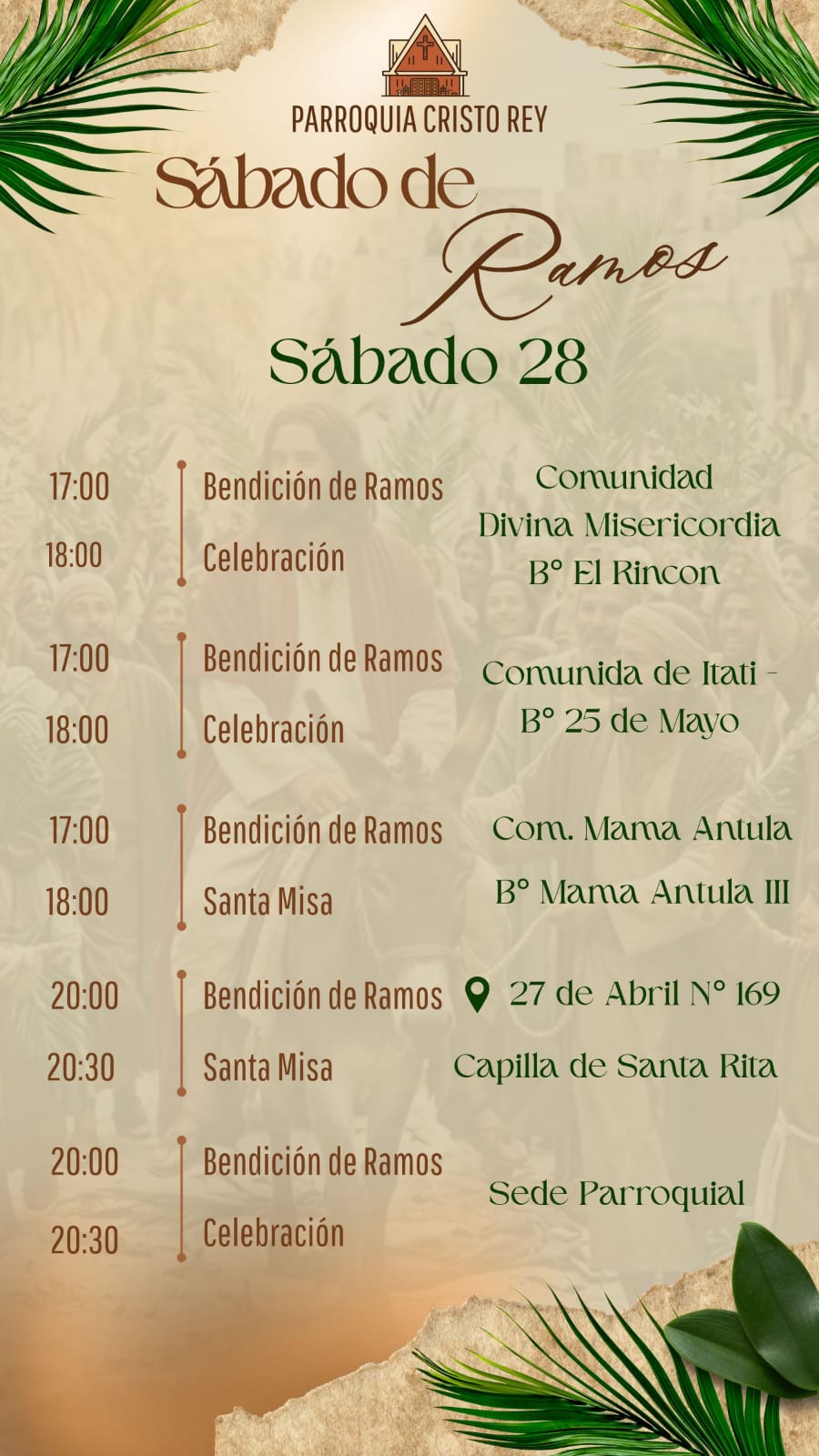 Las celebraciones comenzarán el sábado 28 de marzo, en el marco del Sábado de Ramos, con bendiciones y misas en varios puntos de la ciudad. A las 17 horas habrá bendición de ramos en el barrio El Rincón, en la comunidad de Itatí del barrio 25 de Mayo y en la comunidad Mama Antula III, donde luego se realizarán celebraciones y misas a partir de las 18.