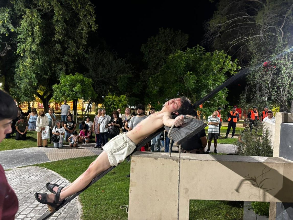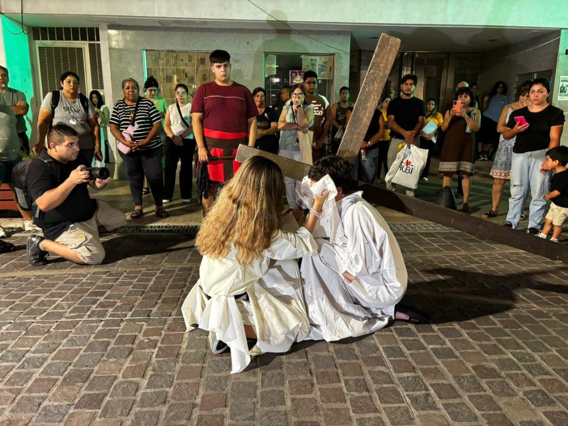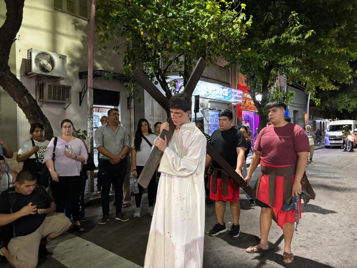 La feligresía de la Iglesia La Merced salió a las calles de la ciudad para llevar el mensaje evangélico al espacio público. Con un despliegue de actores y vecinos que personificaron los momentos cruciales de la Pasión, la representación recorrió las arterias principales de la ciudad. El “via crucis viviente”, adaptado para mostrar la vida y el sacrificio de Cristo, permitió que grandes y chicos se detuvieran a contemplar las estaciones de la cruz en un clima de profundo respeto, finalizando el recorrido en Plaza Libertad.