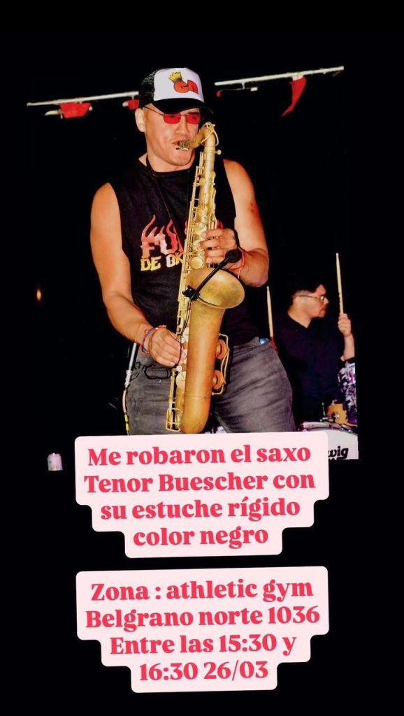 Desde el entorno solicitan la colaboración de la comunidad para poder recuperar el saxofón y dar con los responsables. “Necesitamos información si alguien vio algo”, expresaron, apelando a la difusión del caso.