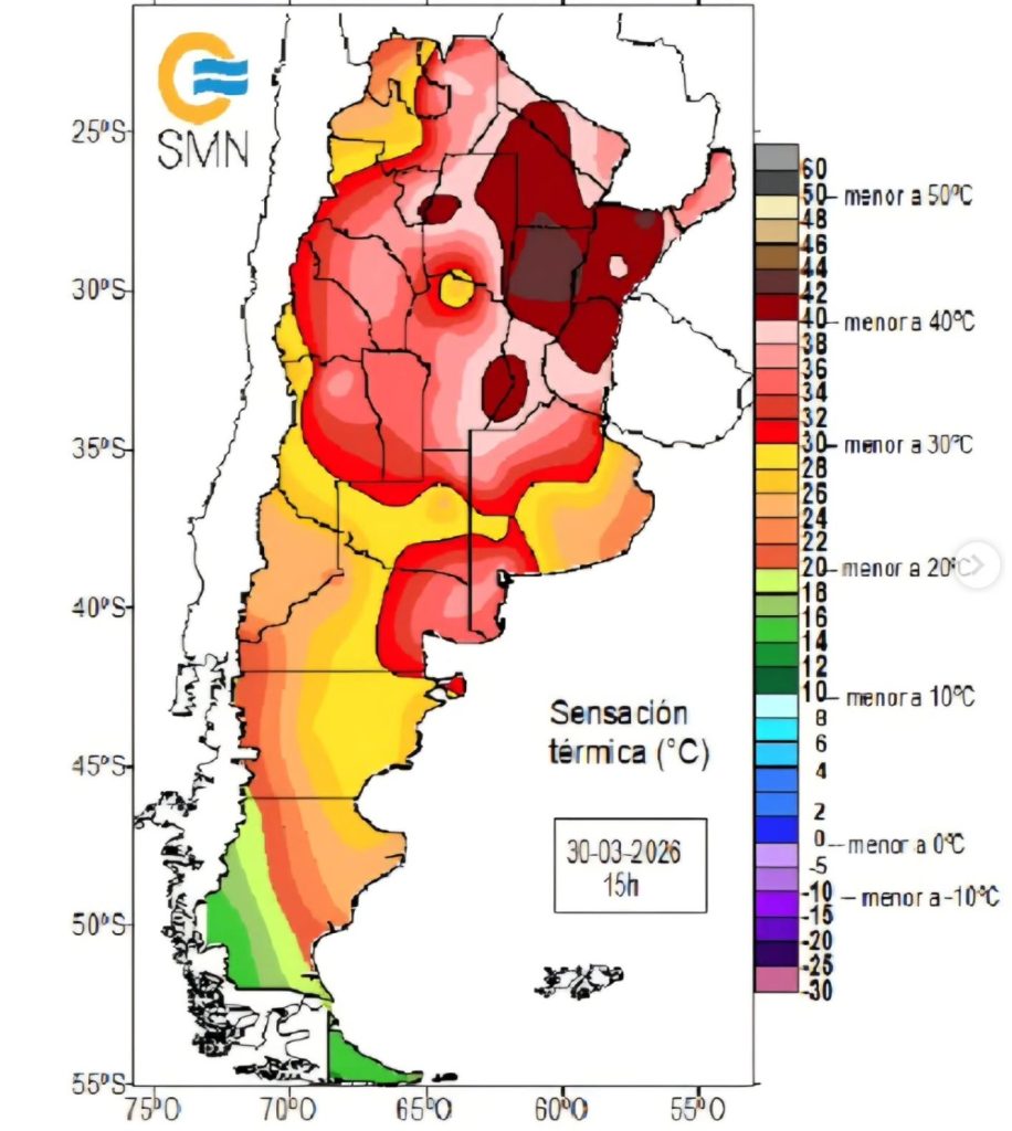 Mínimas elevadas: Las noches no darán respiro, con valores entre 22 y 27 °C, lo que sumado a la humedad extrema, eleva la sensación térmica a niveles agobiantes. Ayer, el norte de Santa Fe ya registró una sensación térmica de 42 °C.