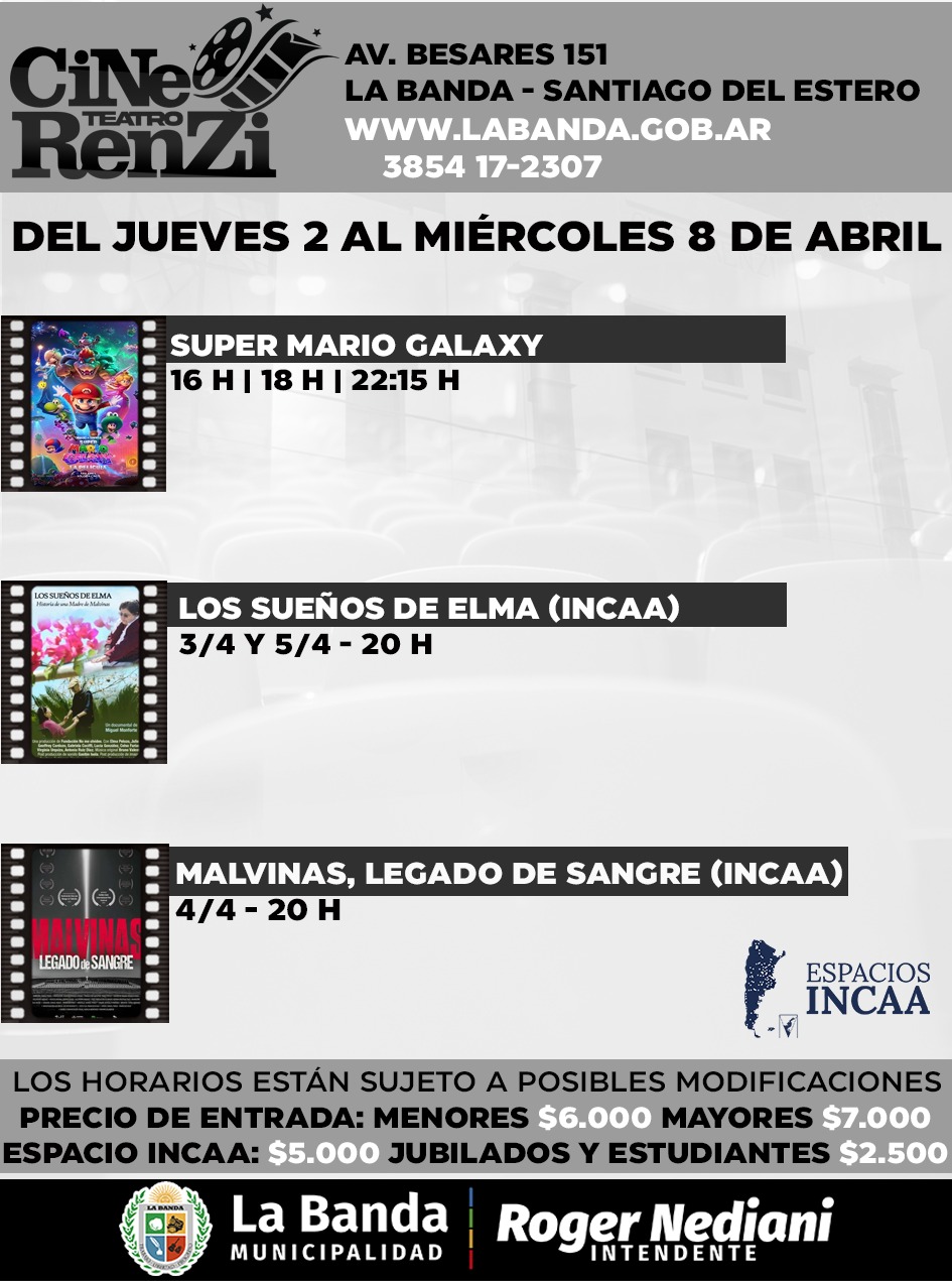 El Cine Teatro Renzi dio a conocer su programación correspondiente del 2 al 8 de abril, destacando el esperado estreno de “Super Mario Galaxy”, una propuesta pensada para toda la familia que llega a la pantalla grande con múltiples funciones.