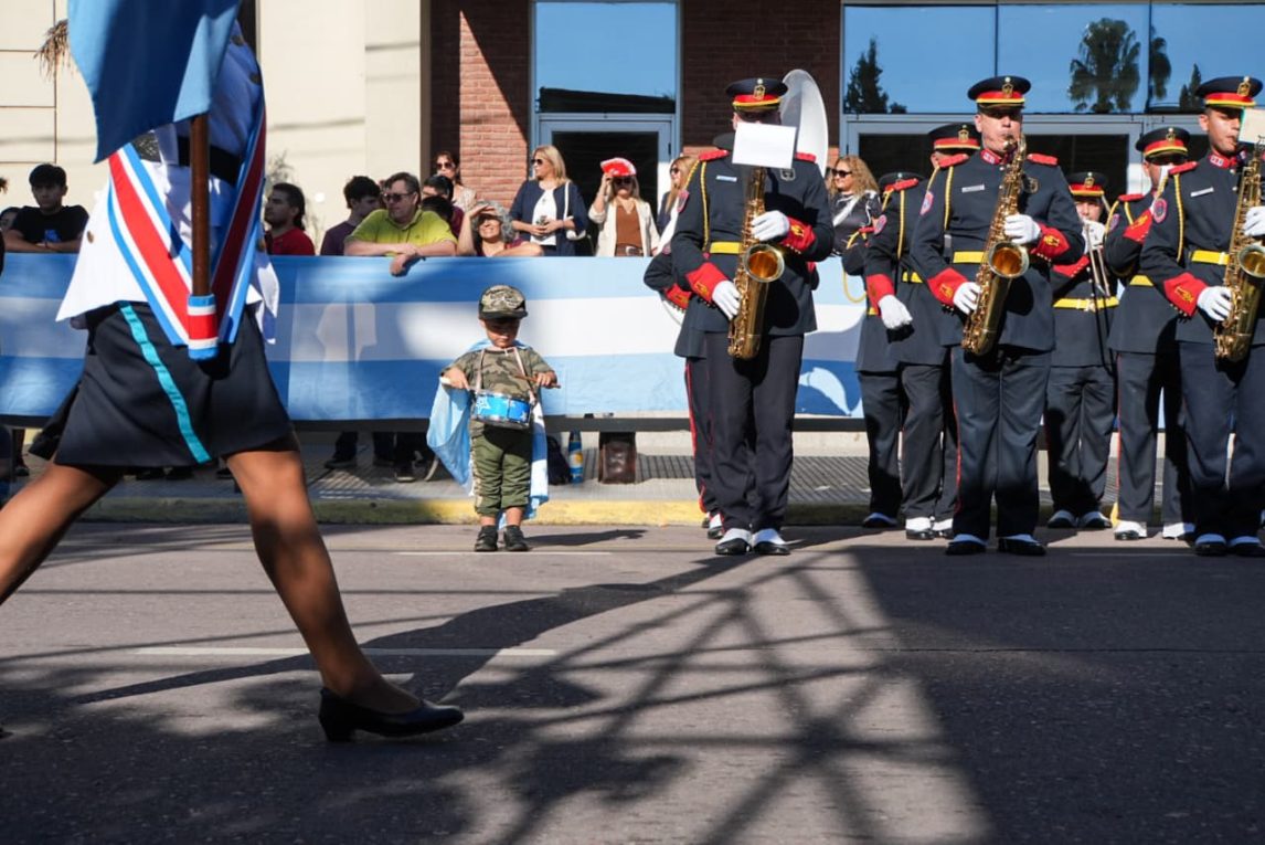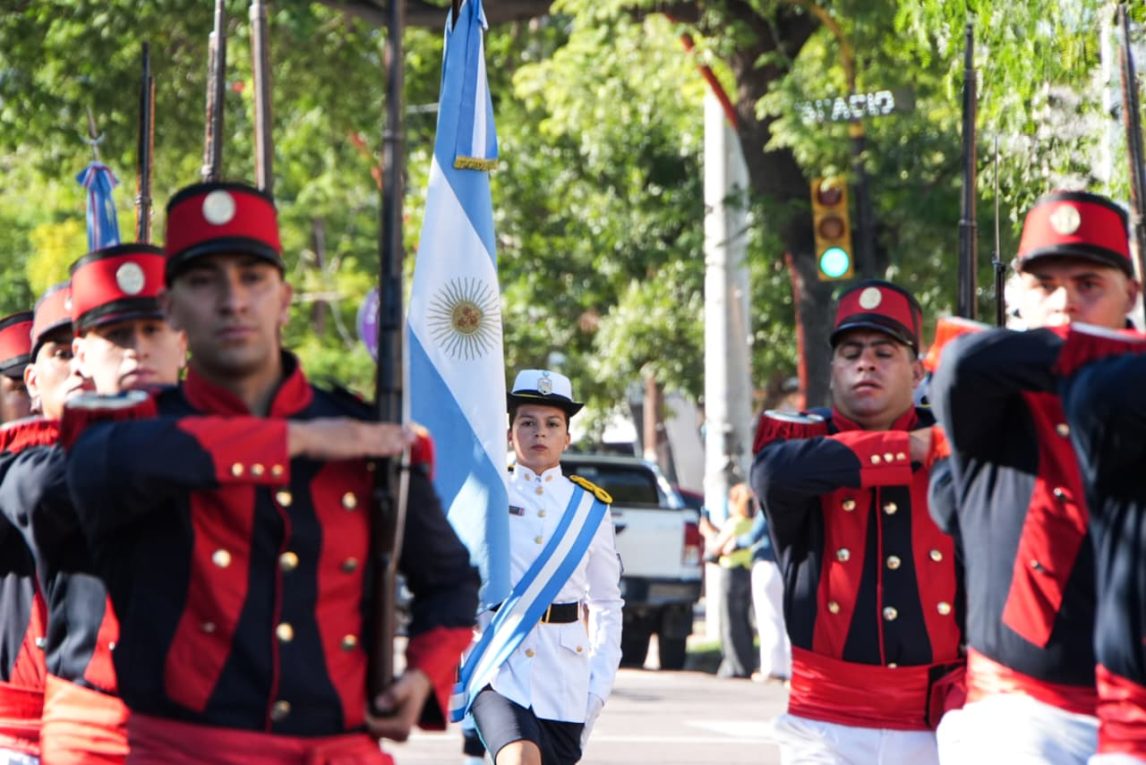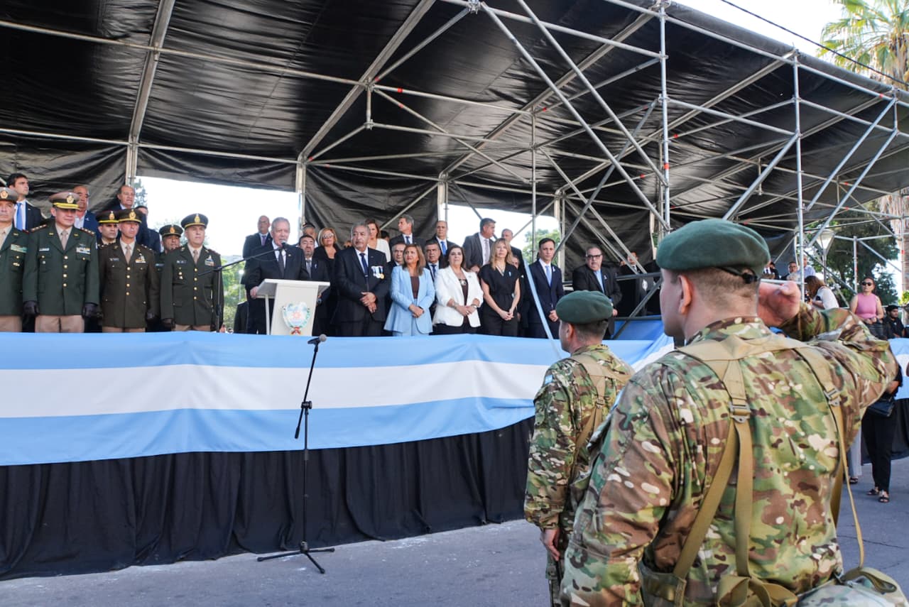 Las actividades comenzaron con el izamiento de banderas, la colocación de ofrendas florales y la revista de tropas por parte del gobernador, quien además saludó a la Agrupación 2 de Abril.