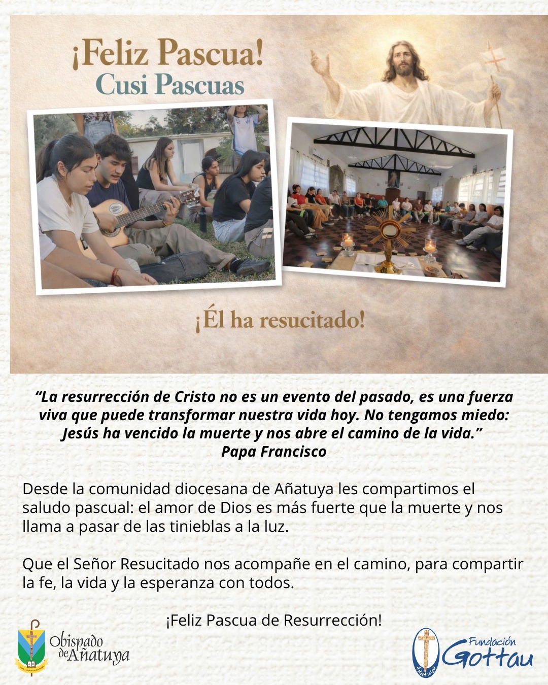 El mensaje concluye con el saludo “¡Feliz Pascua de Resurrección!”, compartido desde el Obispado de Añatuya junto a la Fundación Gottau.