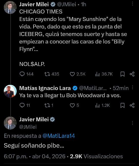El presidente Javier Milei y el santiagueño Matías Ignacio Lara protagonizaron un nuevo cruce en la red social X. Milei utilizó metáforas de la obra "Chicago" para criticar a opositores, mientras que Lara le advirtió sobre la llegada de un "Bob Woodward" (periodista del Watergate). El mandatario cerró la discusión con un irónico "seguí soñando pibe", reeditando una rivalidad que ya cuenta con varios antecedentes digitales.