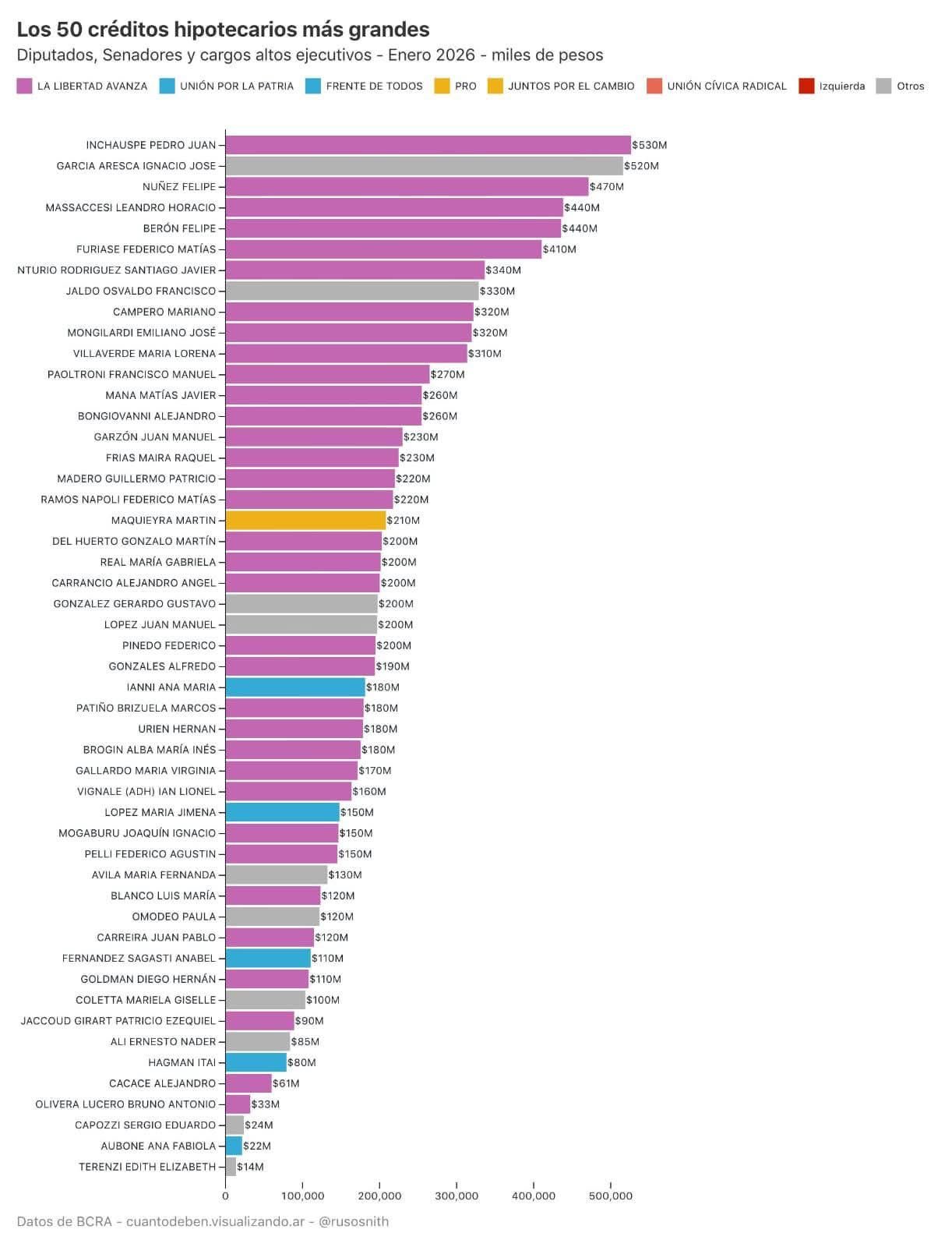 De acuerdo con la información relevada sobre los 50 créditos hipotecarios más altos otorgados a integrantes del sector público, 34 corresponden a personas relacionadas con el Gobierno nacional. Los montos registrados incluyen operaciones que rondan o superan los 300 mil dólares al tipo de cambio correspondiente.