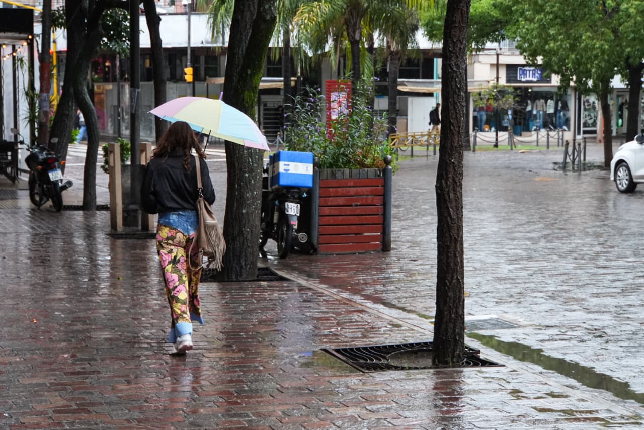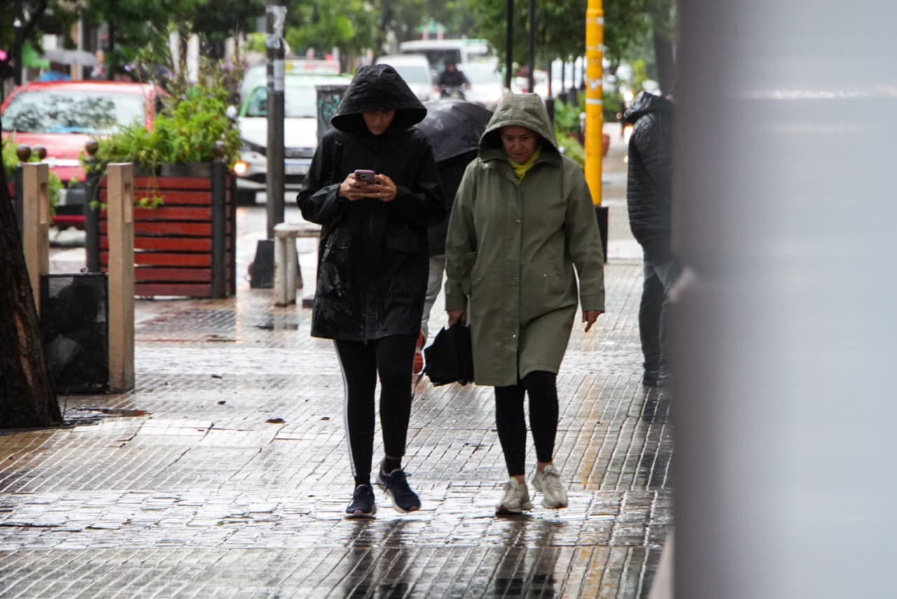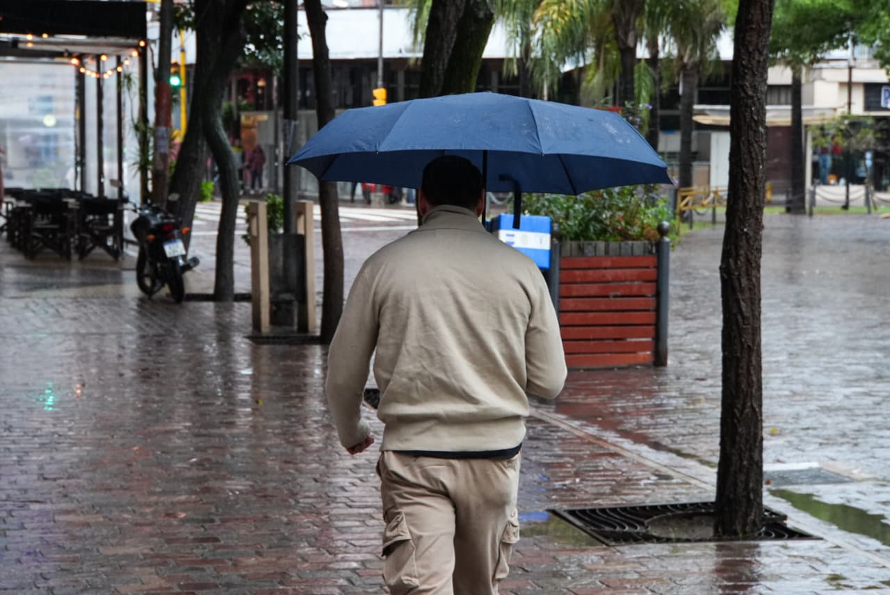 Para la tarde y la noche, se prevé una leve mejora, aunque se mantendrían las condiciones inestables: hay un 40% de probabilidades de lluvias aisladas en ambos períodos, con viento sur en valores similares. Las fotos evidencian calles mojadas, tránsito habitual y peatones circulando con paraguas y ropa impermeable.