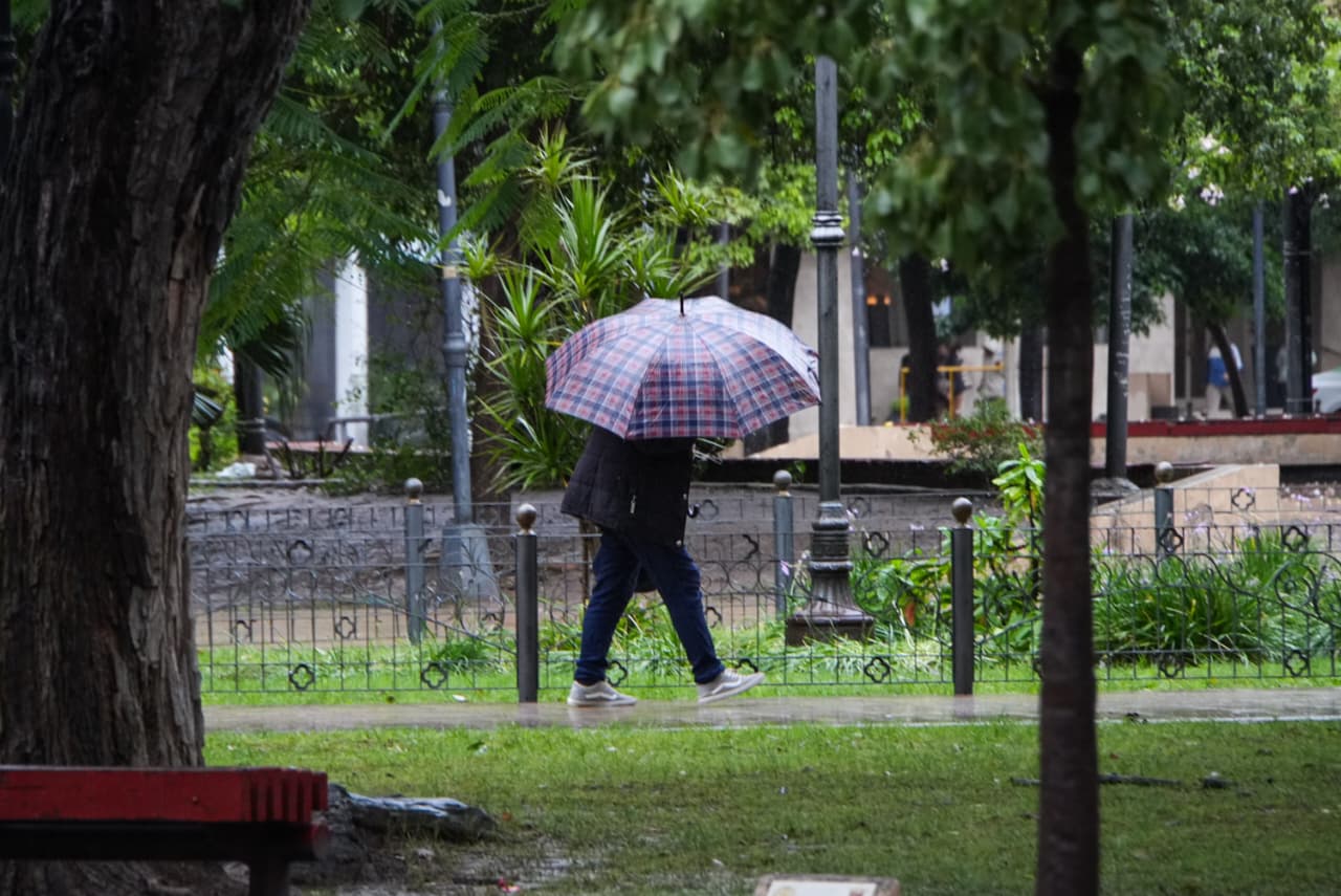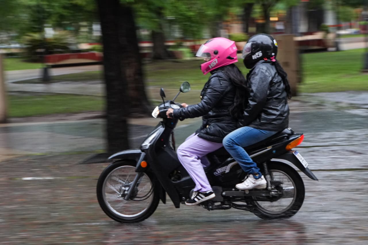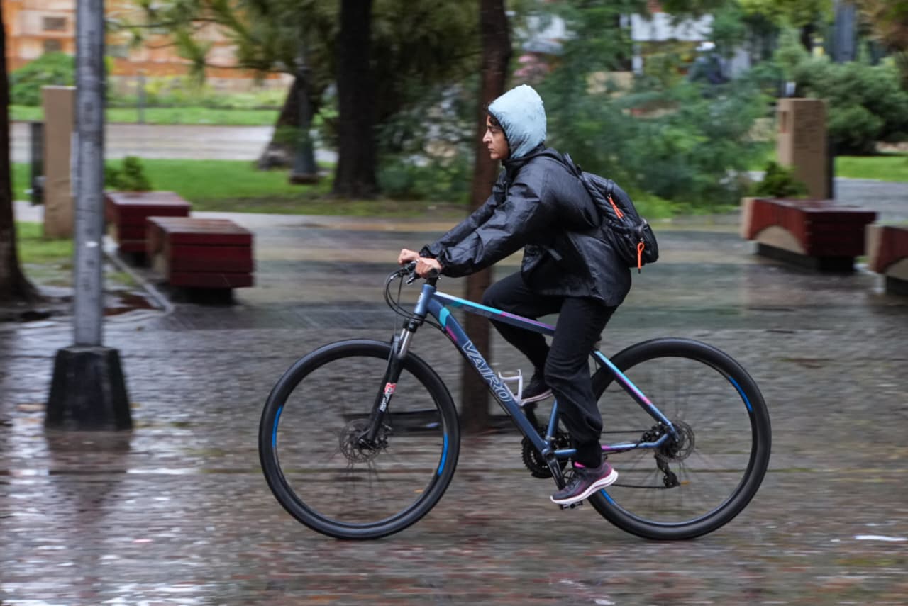 Para la tarde y la noche, se prevé una leve mejora, aunque se mantendrían las condiciones inestables: hay un 40% de probabilidades de lluvias aisladas en ambos períodos, con viento sur en valores similares. Las fotos evidencian calles mojadas, tránsito habitual y peatones circulando con paraguas y ropa impermeable.
