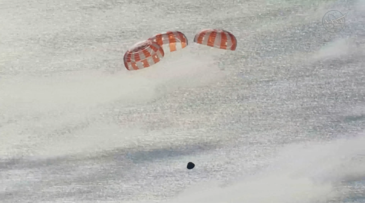 Como estaba previsto, tras el momento crítico, se desplegaron los paracaídas que depositarón la nave Orion con los cuatro astronautas en el Pacífico.