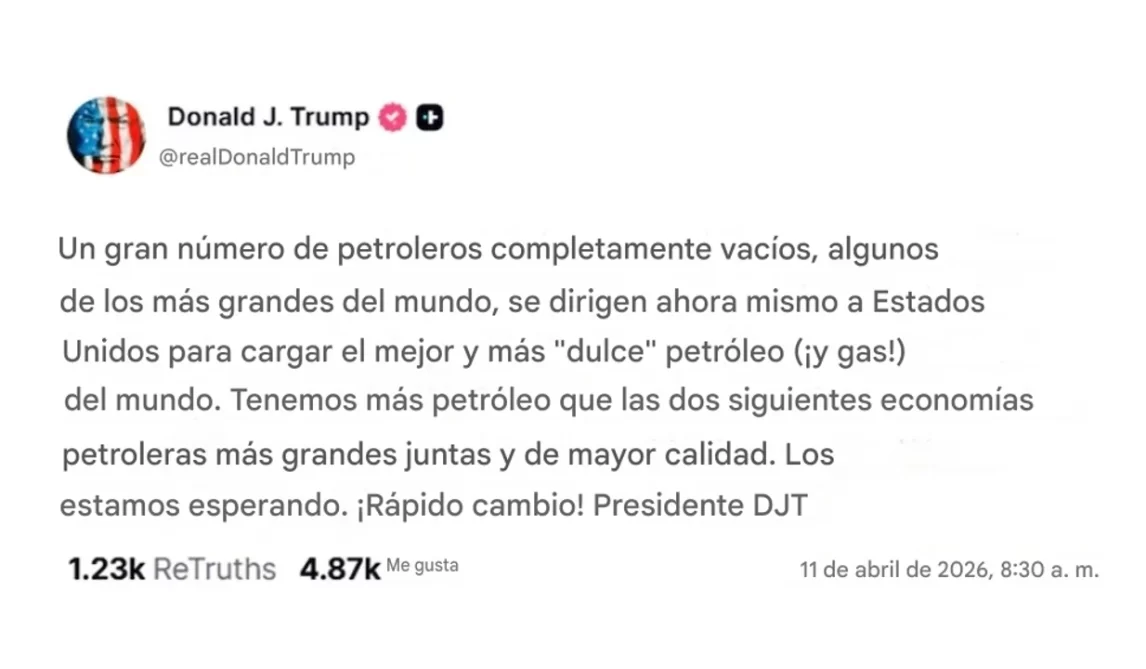 “Un gran número de petroleros completamente vacíos se dirigen ahora mismo a Estados Unidos para cargar el mejor petróleo del mundo”, sentenció el mandatario, subrayando la superioridad energética de su país y su determinación de reabrir por la fuerza la vía marítima más estratégica del planeta.