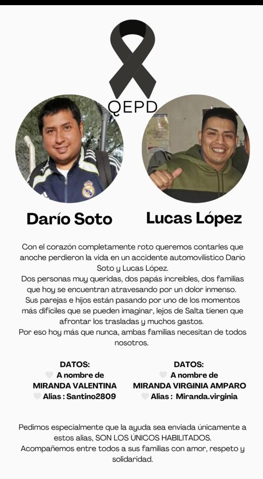 En medio del dolor por la muerte de los hinchas de Juventud Antoniana en el accidente ocurrido sobre la Ruta 34, familiares de las víctimas solicitaron difundir correctamente los alias destinados a colaborar económicamente.