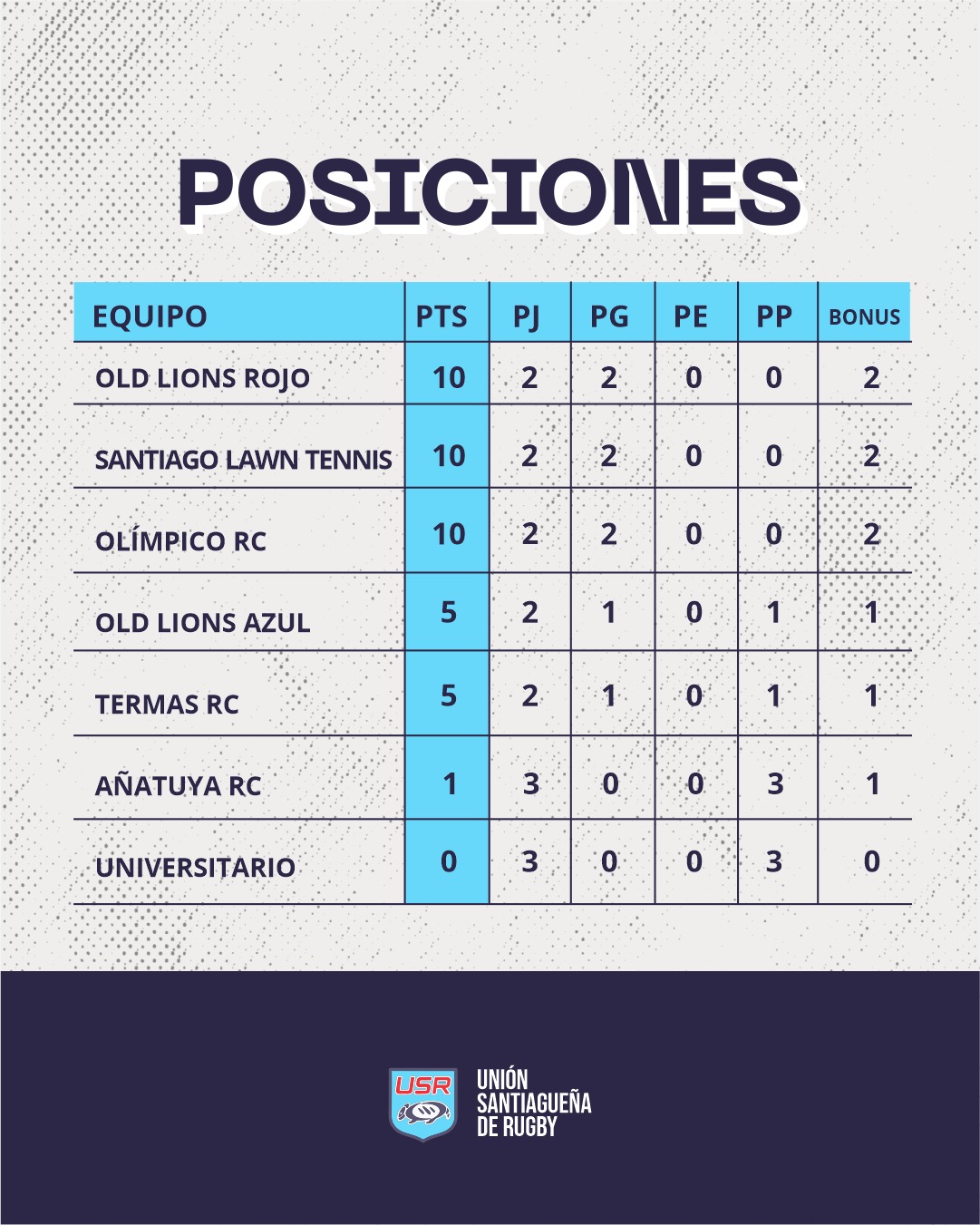 Old Lions Rojo, Santiago Lawn Tennis y Olímpico quedaron al frente de las posiciones del Torneo Apertura “Juan Pablo Vaca Caldera” de la Unión Santiagueña de Rugby tras disputarse el último fin de semana la tercera fecha.