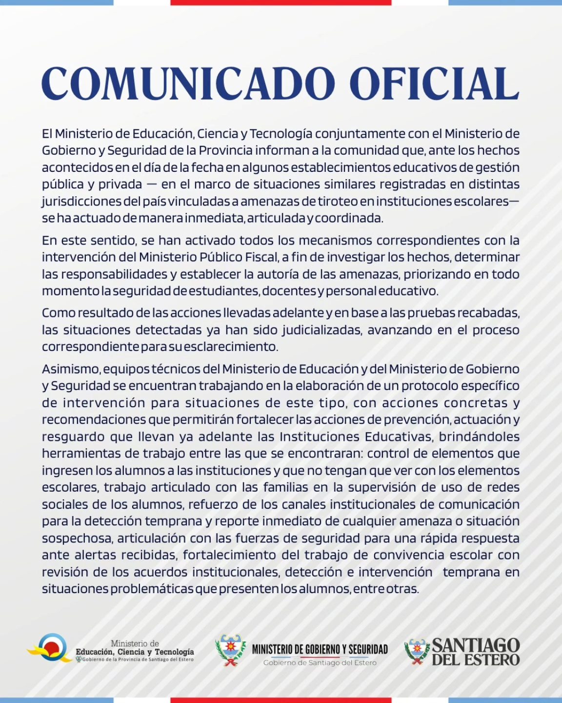 Tras las amenazas de tiroteos registradas en distintos establecimientos educativos de Santiago del Estero, el Ministerio de Educación, Ciencia y Tecnología junto al Ministerio de Gobierno y Seguridad informaron que se actuó de manera inmediata para resguardar a la comunidad escolar.