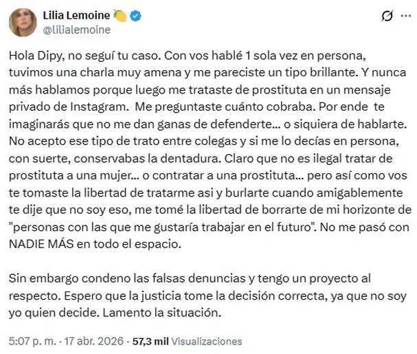 El origen del conflicto: Lemoine aseguró que, tras una charla amena en persona, la relación se rompió cuando El Dipy le preguntó, vía Instagram, cuánto cobraba, tratándola de prostituta.