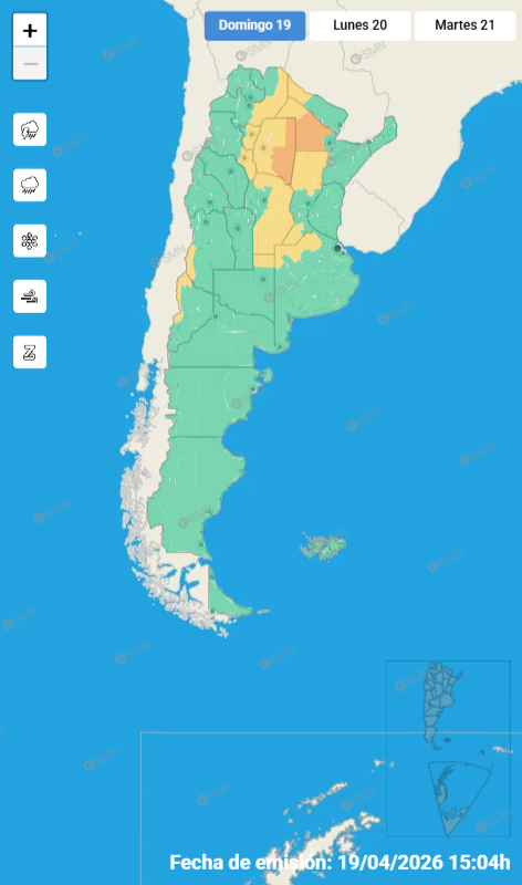 Según el pronóstico, durante la tarde rige un alerta naranja, con probabilidad de tormentas fuertes y algunas localmente severas. Estas condiciones pueden estar acompañadas por abundante caída de agua en poco tiempo, actividad eléctrica frecuente, posible granizo y ráfagas que podrían alcanzar los 70 km/h. En este período se estiman precipitaciones acumuladas entre 60 y 100 milímetros, con posibilidad de valores superiores en algunos sectores.