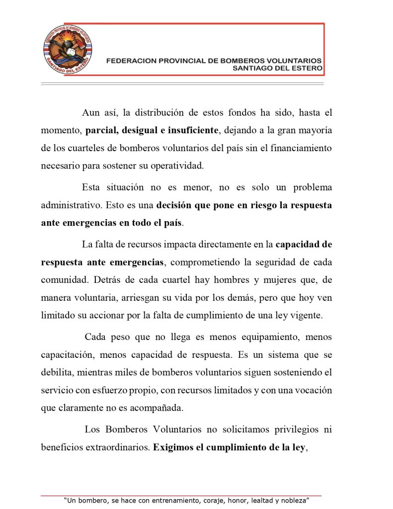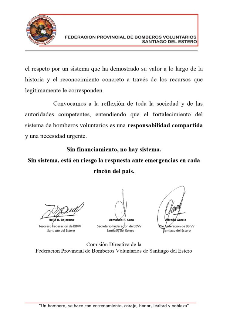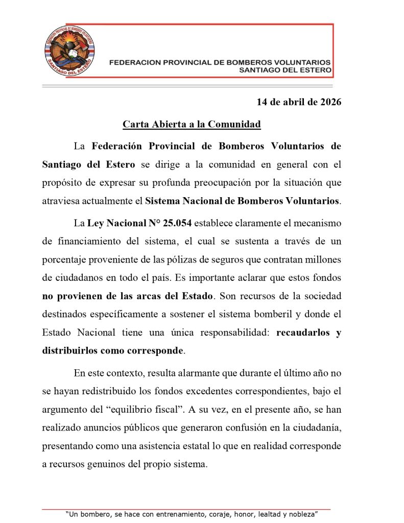 La Federación Provincial de Bomberos Voluntarios de Santiago del Estero emitió una carta abierta a la comunidad en la que expone un escenario crítico para el sistema bomberil argentino por el desfinanciamiento a nivel nacional.