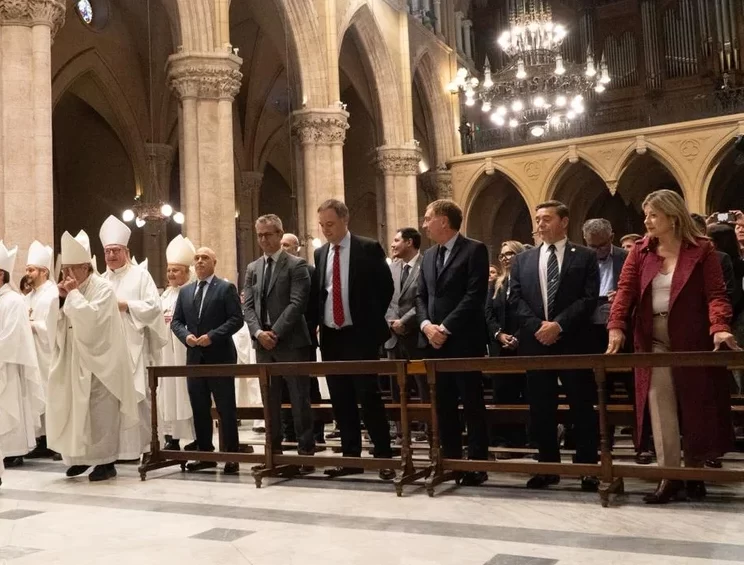 Mientras Villarruel rezaba en Almagro, en Luján la primera fila exhibió una postal del oficialismo encabezada por Manuel Adorni, Diego Santilli, Martín Menem y Bartolomé Abdala. En el mismo recinto, aunque filas más atrás, se ubicaron referentes del peronismo como Axel Kicillof, “Wado” de Pedro e intendentes del conurbano.