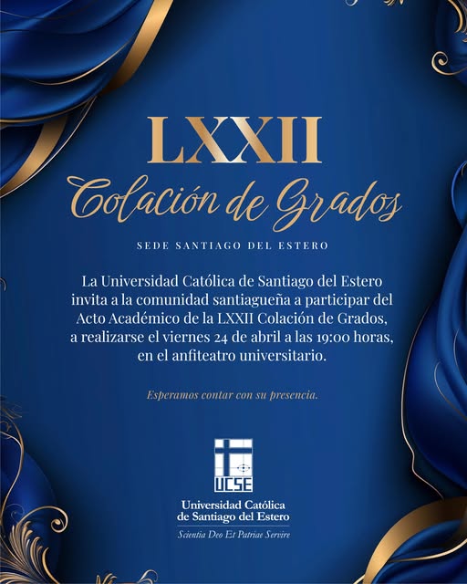 La Universidad Católica de Santiago del Estero realizará este viernes 24 de abril el Acto Académico correspondiente a la LXXII Colación de Grados en su sede central, en un evento que convoca a toda la comunidad a acompañar a los nuevos profesionales en uno de los momentos más importantes de su formación.