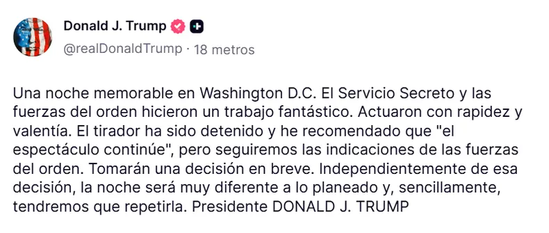 La incertidumbre que reinaba en el Hotel Washington Hilton tras las detonaciones fue disipada por el propio Donald Trump. Desde su refugio seguro, y mientras las fuerzas tácticas aún aseguraban el perímetro, el presidente de los Estados Unidos utilizó su plataforma, Truth Social, para enviar un mensaje de calma y firmeza a sus seguidores y a los tres mil asistentes que quedaron bajo resguardo en el salón de la gala.