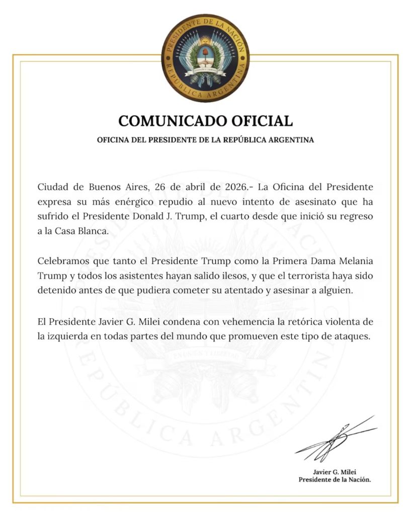 La Oficina del Presidente Javier Milei expresó un enérgico repudio al tiroteo registrado en el hotel Washington Hilton, donde se celebraba la cena anual de la Asociación de Corresponsales de la Casa Blanca con la presencia de Donald Trump, Melania Trump y altos funcionarios estadounidenses.