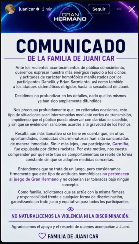 En los últimos días, distintos videos comenzaron a circular entre los seguidores del reality, donde se observan e interpretan situaciones consideradas ofensivas. A partir de esa repercusión, el entorno del participante decidió emitir un comunicado en el que manifestó su rechazo a expresiones que calificaron como discriminatorias por orientación sexual, presuntamente protagonizadas por Brian Sarmiento y Danelik.