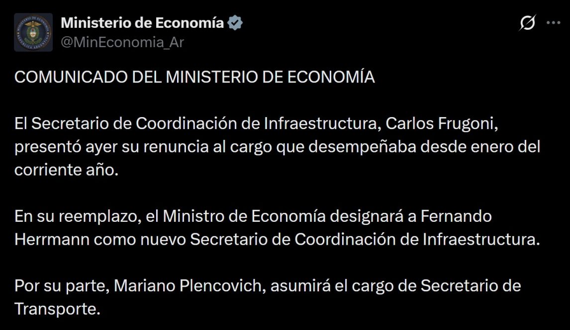 En simultáneo, el Palacio de Hacienda confirmó a Mariano Plencovich como el nuevo Secretario de Transporte. Esta designación se considera estratégica para el corto plazo, ya que Plencovich deberá liderar mesas de negociación determinantes para el clima social: